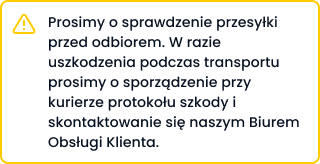 Prosimy o sprawdzenie przesyłki przed odbiorem. W razie uszkodzenia podczas transportu prosimy o sporządzenie przy kurierze protokołu szkody i skontaktowanie się z naszym Biurem Obsługi Klienta.
