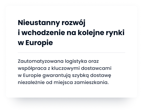 Dzięki zautomatyzowanym procesom logistycznym, jesteśmy w stanie zagwarantować szybką i niezawodną dostawę produktów do klientów. Dbamy o to, aby każdy etap realizacji zamówienia przebiegał sprawnie spełniając najwyższe standardy.